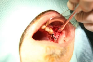 挿入された2本のインプラント。この状態は挿入用のエクステンションがついている。これをトルクレンチのようなもので適度なちからで骨に埋め、操作ようのエクステンションはとりさるのだそうです。