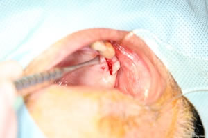 まず、インプラントを今回は2本埋めるのだが、その部分の左の上顎の歯ぐきを切開して上顎の骨を出す。