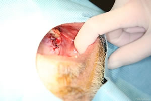 切開した歯ぐきを縫い合わせて手術終了。インプラントは縫い合わされた歯ぐきの肉に埋もれる。